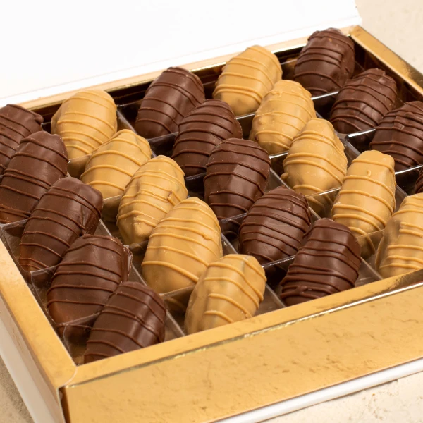 Premium assorted stuffed dates coated in rich milk and white chocolate, elegantly packed in a luxury gift box. Perfect for Ramadan gifting, corporate hampers, and Eid celebrations
