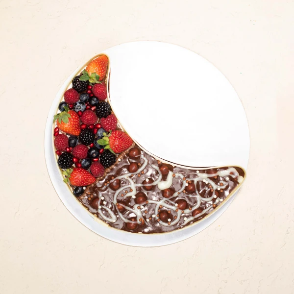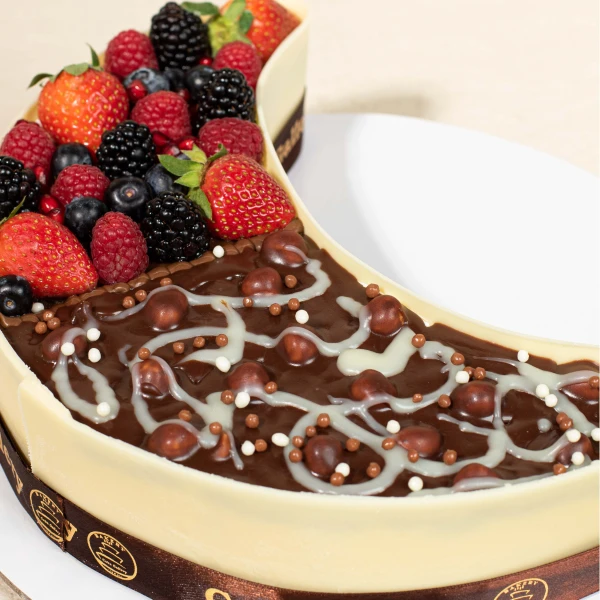 Rich chocolate and vanilla truffle moon cake with smooth creamy layers. Perfect for Iftar desserts and Ramadan gifting.
